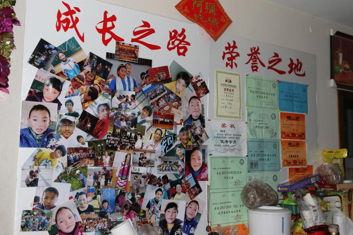 挂滿孩子們照片和(hé)獎狀的牆壁